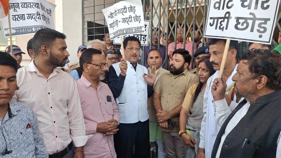 देहरादून,। देशव्यापी वोट चोर गद्दी छोड़ अभियान के तहत आज उत्तराखंड प्रदेश कांग्रेस कमेटी के वरिष्ठ उपाध्यक्ष संगठन सूर्यकांत धस्माना के नेतृत्व में पार्टी के कार्यकर्ताओं ने रिंग रोड स्थित राज्य निर्वाचन आयोग कार्यालय का घिराव कर वहां जबरदस्त प्रदर्शन किया व प्रदेश के राज्यपाल लेफ्टीनेंट जनरल गुरमीत सिंह से तत्काल राज्य के राज्य निर्वाचन आयुक्त सुशील कुमार को बर्खास्त करने की मांग की। अपने पूर्व घोषित कार्यक्रम के अनुसार काफी संख्या में कांग्रेस कार्यकर्ता प्रदेश उपाध्यक्ष संगठन सूर्यकांत धस्माना के नेतृत्व में साढ़े बारह बजे राज्य निर्वाचन आयोग कार्यालय पहुंचे जहां कार्यक्रम की सूचना पा कर पहले ही बड़ी संख्या में सीओ रायपुर के नेतृत्व में भरी पुलिस बल तैनात था। आयोग के कार्यालय के मुख्य द्वार से धस्माना के नेतृत्व में कार्यकर्ता हाथों में तख्तियां लिए राज्य निर्वाचन आयुक्त के कार्यालय की ओर बड़े जहां सीओ रायपुर ने धस्माना को बताया कि राज्य निर्वाचन आयुक्त कार्यालय में उपस्थित नहीं है जिस पर धस्माना व अन्य कार्यकर्ताओं ने प्रदर्शन शुरू कर दिया और पूरा आयोग परिसर वोट चोर गद्दी छोड़ के नारों से गूंज उठा।