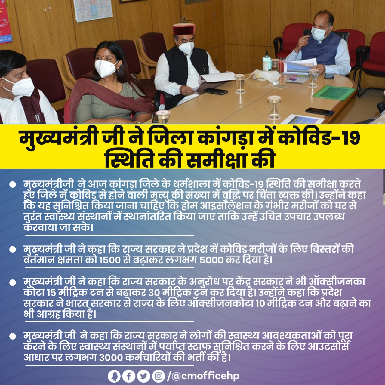 Himachal pradesh: मुख्यमंत्री जय राम ठाकुर जी ने आज कांगड़ा जिले के धर्मशाला में Covid-19 स्थिति की समीक्षा करते हुए जिले में कोविड से होने वाली मृत्यु की संख्या में वृद्धि पर चिंता व्यक्त की। उन्होंने कहा कि यह सुनिश्चित किया जाना चाहिए कि होम आइसोलेशन के गंभीर मरीजों को घर से तुरंत स्वास्थ्य संस्थानों में स्थानांतरित किया जाए ताकि उन्हें उचित उपचार उपलब्ध करवाया जा सके।