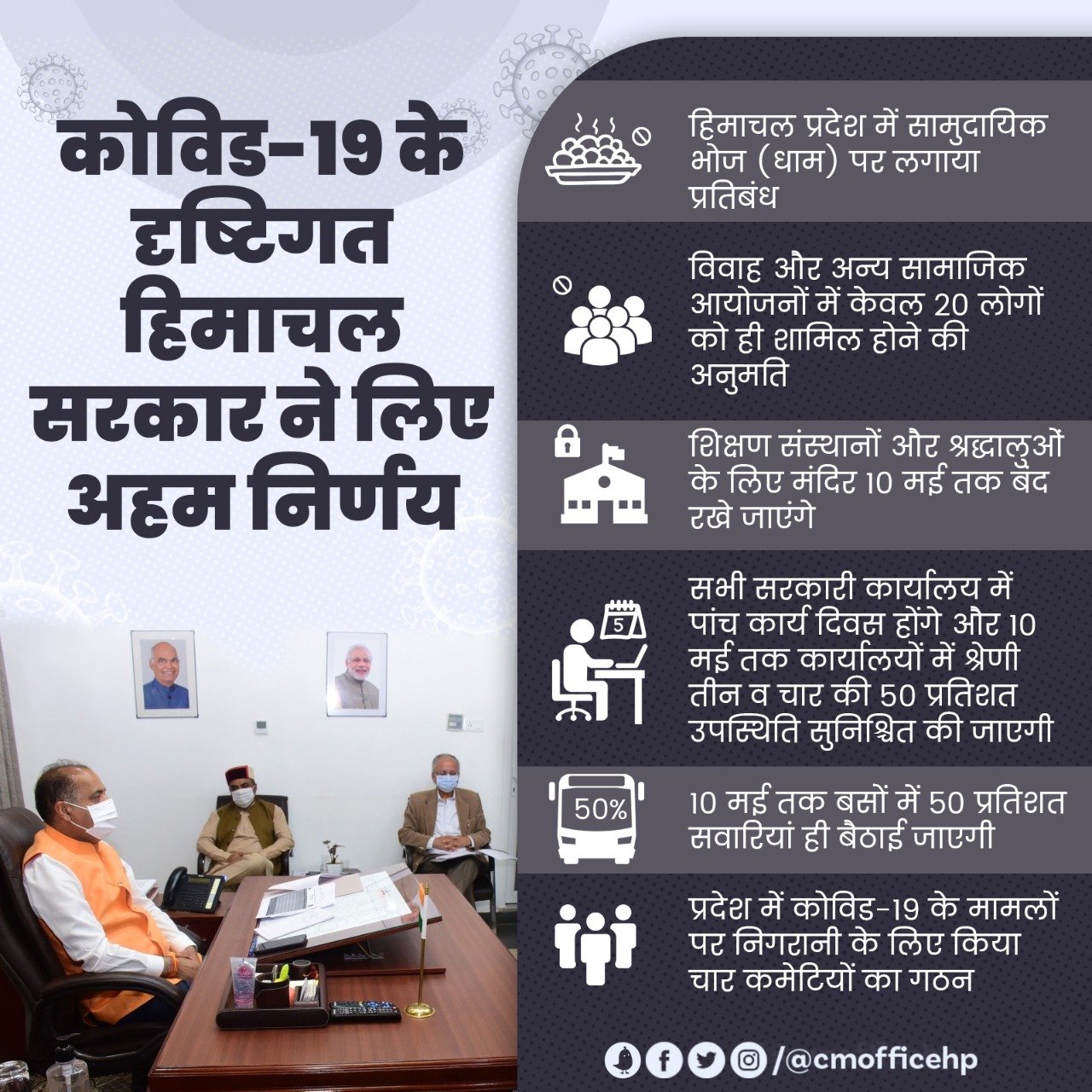 हिमाचल सरकार ने विवाह और अन्य सामाजिक आयोजनों में केवल 20 लोगों को ही शामिल होने की अनुमति देने का निर्णय लिया है। प्रदेश के सभी शैक्षणिक संस्थान और श्रद्धालुओं के लिए मंदिर भी 10 मई तक बंद रहेंगे। सभी सरकारी कार्यालय में पांच कार्य दिवस होंगे और 10 मई तक कार्यालयों में श्रेणी तीन व चार की 50 प्रतिशत उपस्थिति सुनिश्चित की जानी चाहिए।