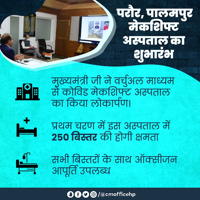 मुख्यमंत्री श्री जयराम ठाकुर जी ने आज शिमला से जिला कांगड़ा के पालमपुर उपमण्डल के परौर में कोविड-19 रोगियों के लिए मेकशिफ्ट अस्पताल का लोकार्पण किया। प्रथम चरण में अस्पताल में 250 बिस्तर क्षमता होगी। इस अवसर पर मुख्यमंत्री जी ने इस मेकशिफ्ट अस्पताल के लिए प्रदेश सरकार को भूमि प्रदान करने के लिए राधा स्वामी सत्संग ब्यास का आभार व्यक्त किया। उन्होंने कहा कि राधा स्वामी सत्संग ब्यास के स्वयंसेवी, रोगियों तथा उनके परिजनों को भोजन प्रदान करेंगे, जो कि मानवता की महान सेवा है। उन्होंने कहा कि कोविड-19 के रोगियों का बेहतर उपचार सुनिश्चित करने के लिए इस मेकशिफ्ट अस्पताल के सभी बिस्तरों के साथ ऑक्सीजन आपूर्ति उपलब्ध है।